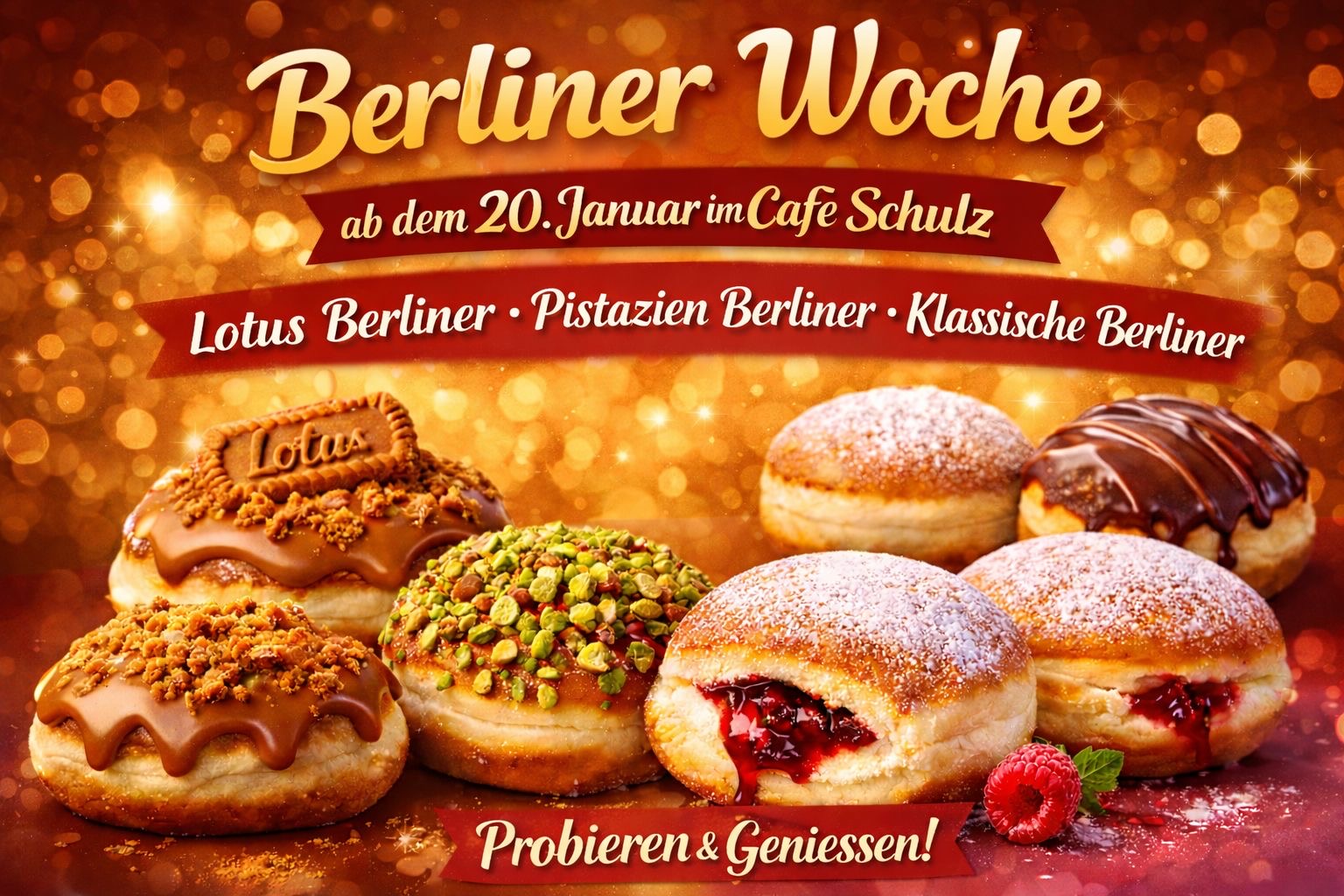 Wir starten unsere Berliner Wochen am 20. Januar 2026. Lassen Sie sich von vielen verschiedenen Sorten überraschen und entdecken Sie unsere exklusiven Kreationen wie Baileys- Berliner, Nutella- Berliner oder den trendigen Pistazien- Berliner!